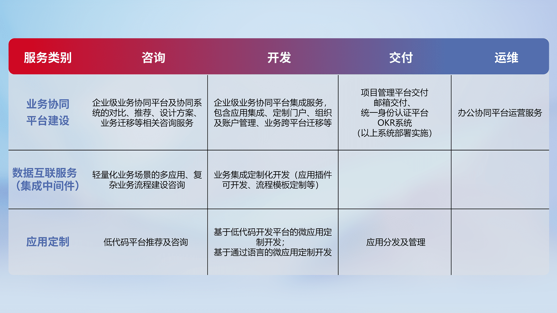 针对钉钉、、、企微、、IDaas等平台级产品提供产品的规划、、方案、、、、交付、、定制化开发等服务,,,实现如统一协同办公、、、、智能客户服务、、混合会议管理、、智能数据查询、、、等业务场景,,,,实现数字化转型。。。。